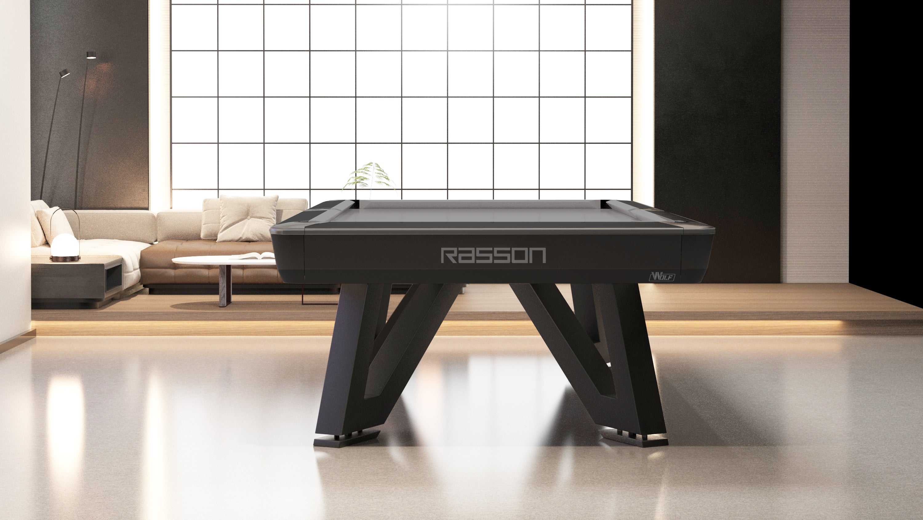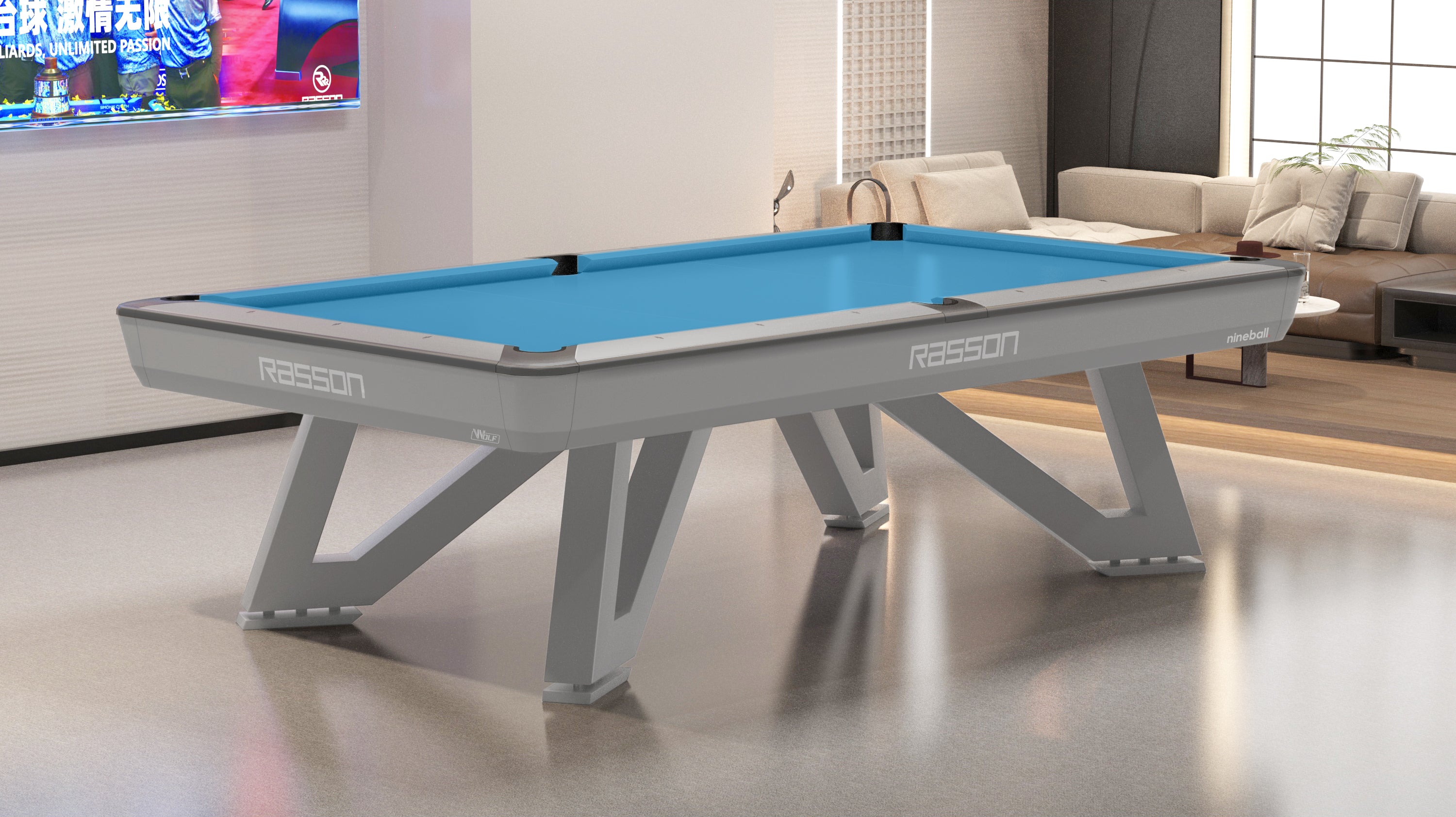 Engineered with a 30mm thick premium Rasson slate, RASSON MAX (K55) rubber cushions, and a precision aluminum alloy beam, the Wolf offers unmatched consistency, fast ball response, and long-term structural integrity. Its steel legs, finished in fluorocarbon paint, provide exceptional strength, while the aluminum alloy apron and solid support structure ensure tournament-grade stability. The patented Slate Leveling System (SLS) and Leg Leveling System (LLS) guarantee precise table alignment for the ultimate playing experience.